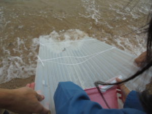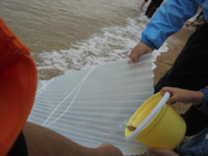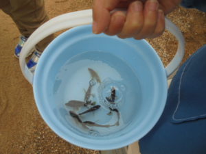 バケツに入っているキジハタを「大きく育ってね」と言いながら海に放流しました