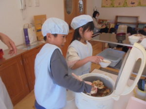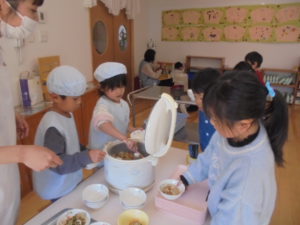 就学に向けての活動が始まりました ひまわり組が就学に向けて、給食の時間を遅くしました☆彡 当番活動も増え、お友だちのご飯をよそっています。 「多め?少なめ?」きちんと聞いてよそうことができていました(^0^)/ これから順番にお当番をしていきます。 今日からみんなで一緒に「いただきます」をして25分で食べきれるように頑張ります (⋈◍>◡<◍)。✧♡