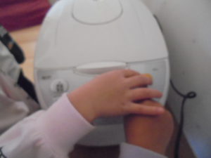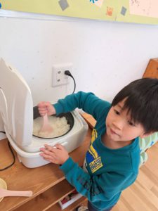 ひまわり組のお当番がご飯のスイッチを押しています☆彡