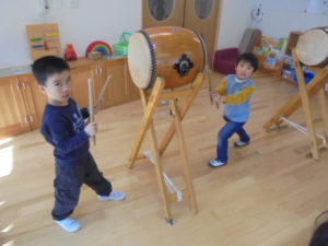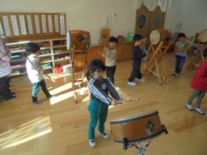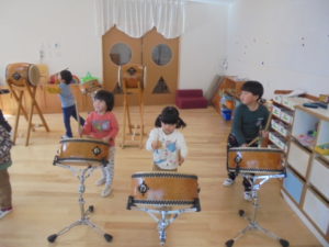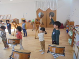 音遊びがありました 音遊びがあり、ゆり組が参加しました☆彡 しっかりした音でたたくことができていました(⋈◍>◡<◍)。✧♡ ジャンプや手の伸ばし方も教えていただき 六ッ森先生に褒めてもらいました(^0^)/