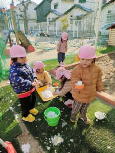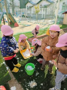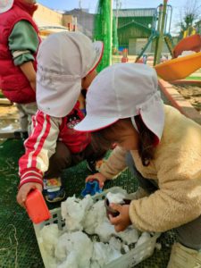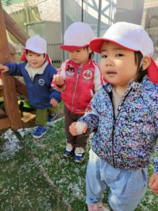 昨日降った雪がまだ園庭に残っていて、雪の感触を楽しみました⛄